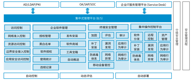 部署該系統(tǒng)后,可對(duì)上海國(guó)際信托的接入安全、桌面安全、使用安全進(jìn)行統(tǒng)一的管控和審計(jì)。企業(yè)不必再擔(dān)心辦公終端成為外部入侵與攻擊的目標(biāo)和入口,同時(shí)分級(jí)部署、策略下發(fā)、訪問(wèn)控制、補(bǔ)丁管理、移動(dòng)存儲(chǔ)等功能和大數(shù)據(jù)引擎的加持在保障上海國(guó)際信托基本需求的同時(shí),讓體驗(yàn)更進(jìn)一步。