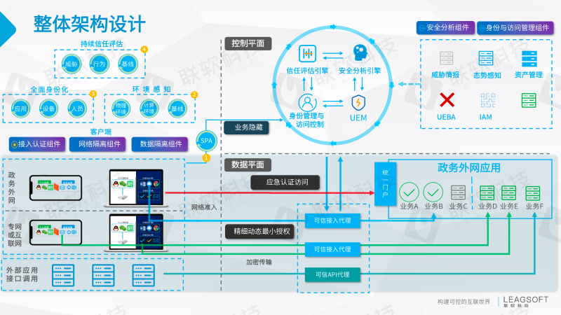 聯(lián)軟政務(wù)外網(wǎng)終端一機兩用SDP解決方案,基于SDP架構(gòu)的端到端零信任訪問控制,方案由零信任管理平臺+零信任安全網(wǎng)關(guān)+零信任客戶端三部分組成。