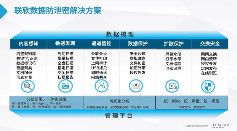 構(gòu)建覆蓋數(shù)據(jù)全生命周期、契合企業(yè)多元業(yè)務場景,全面完善的數(shù)據(jù)安全防護體系,是應對“內(nèi)鬼式”數(shù)據(jù)泄密事件的核心。聯(lián)軟科技作為數(shù)據(jù)丟失防護(DLP)領域的領先企業(yè),推出了面向政企可落地、有效果、安全和效率統(tǒng)一的數(shù)據(jù)防泄密方案。