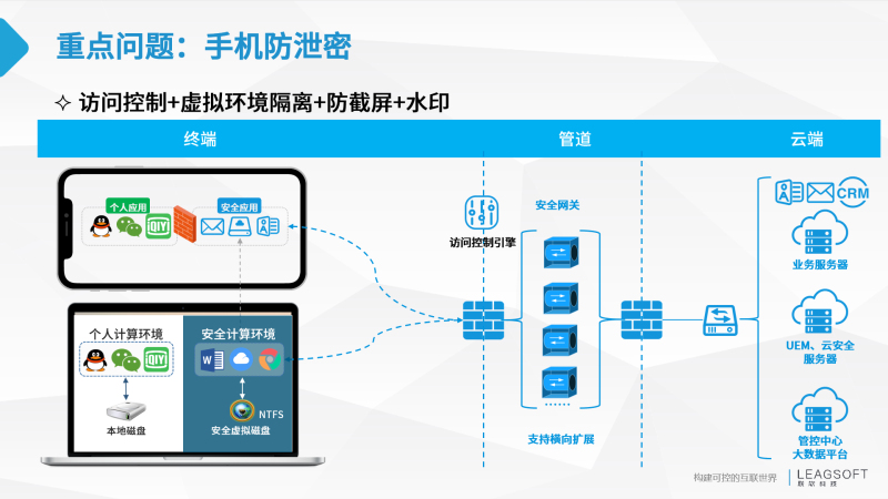 ● 針對手機防泄密:訪問控制+虛擬環(huán)境隔離+防截屏+水印