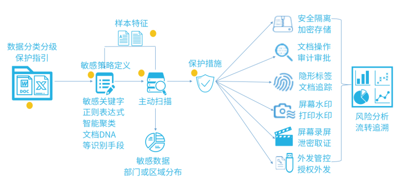 通過事前泄密趨勢分析,事中審計、阻攔,事后挖掘追溯來有效管控數(shù)據(jù)的泄密風險。