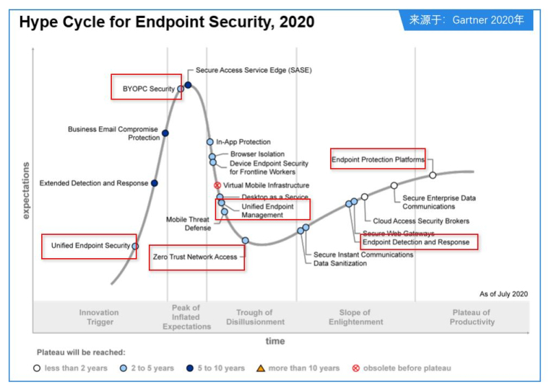 根據(jù)Gartner2020年端點(diǎn)安全技術(shù)成熟度曲線提出,越來越多的用戶希望能夠基于一個(gè)平臺(tái)對(duì)所有終端進(jìn)行安全管理。