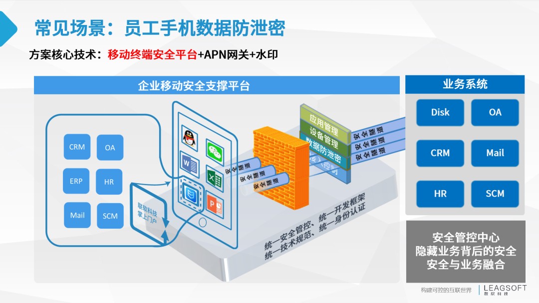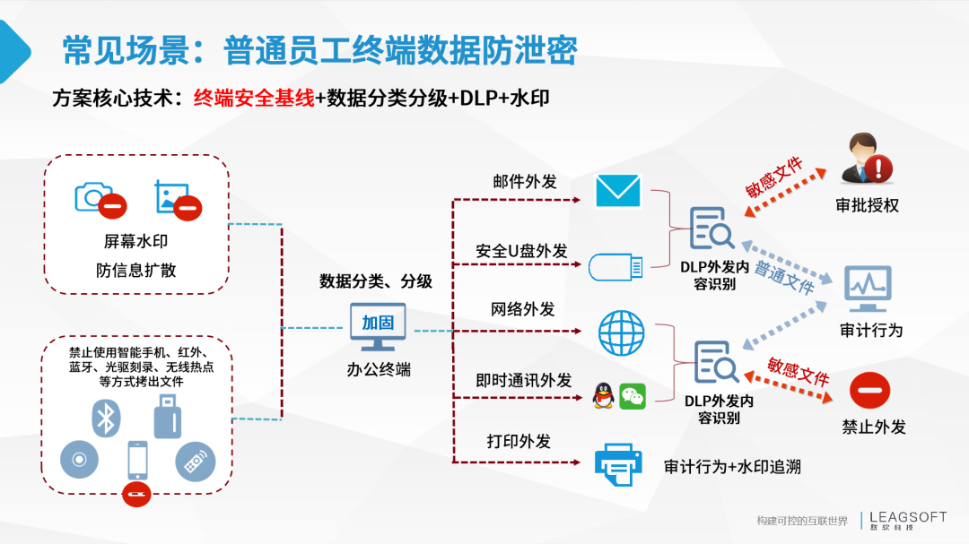 針對(duì)數(shù)據(jù)泄露,聯(lián)軟基于“控制+便利+威懾”,提出以場(chǎng)景驅(qū)動(dòng)的數(shù)據(jù)防泄密整體解決方案,多種數(shù)據(jù)防泄露技術(shù)運(yùn)用融合,實(shí)現(xiàn)基于場(chǎng)景的全生命周期數(shù)據(jù)安全管理。