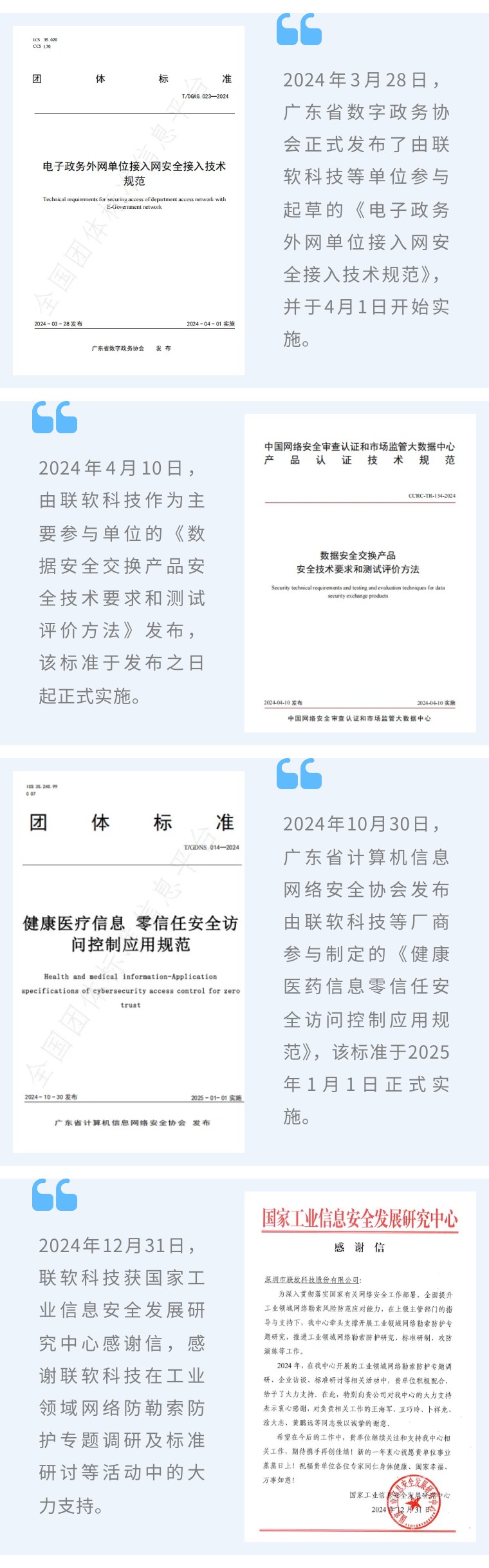 聯(lián)軟科技在網(wǎng)絡(luò)安全領(lǐng)域的卓越表現(xiàn),不僅體現(xiàn)在始終保持探索與創(chuàng)新的產(chǎn)品和解決方案上,更在于其對(duì)行業(yè)標(biāo)準(zhǔn)的積極參與和貢獻(xiàn)。近年來(lái),公司多次受邀參與國(guó)家及地方網(wǎng)絡(luò)安全相關(guān)標(biāo)準(zhǔn)的制定工作,為行業(yè)的規(guī)范化發(fā)展貢獻(xiàn)力量。