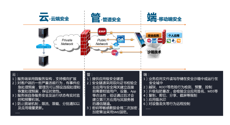 統(tǒng)一的安全框架解決數(shù)據(jù)安全、通信安全、應用安全、移動設(shè)備統(tǒng)一安全管理等問題。