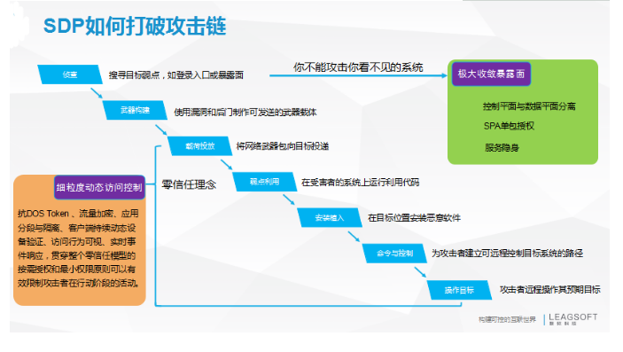 那么SDP是如何打破攻擊鏈的?這里要提一下,不管網(wǎng)絡(luò)安全技術(shù)如何發(fā)展,暴露面收斂依然是網(wǎng)絡(luò)安全的核心原則。SDP通過抗DOS Token 、流量加密、應(yīng)用分段與隔離、客戶端持續(xù)動態(tài)設(shè)備驗證、訪問行為可視、實時事件響應(yīng)以及貫穿整個零信任模型的按需授權(quán)和最小權(quán)限原則可以有效限制攻擊者在行動階段的活動,在多個環(huán)節(jié)打破攻擊鏈,極大提高攻擊者的成本。