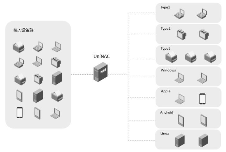 通過部署聯(lián)軟科技潛心研發(fā)的UniNAC產(chǎn)品,對接入設(shè)備的網(wǎng)絡(luò)行為進(jìn)行智能分析、歸納,能夠智能的對設(shè)備類型識別判斷,可以很好的解決企業(yè)內(nèi)部各種硬件設(shè)備類型識別。同時(shí),結(jié)合UniNAC產(chǎn)品中的網(wǎng)絡(luò)準(zhǔn)入控制功能,可以為每類硬件設(shè)備劃分不同的網(wǎng)絡(luò)訪問權(quán)限,為構(gòu)造可控的互聯(lián)世界提供堅(jiān)固的基石。