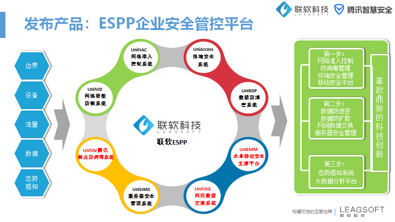 鄧振波表示,“這次與聯(lián)軟合作的產(chǎn)品叫騰訊御點(diǎn)終端安全管理系統(tǒng),這個終端安全管理系統(tǒng)跟傳統(tǒng)的安全管理系統(tǒng)區(qū)別在于是構(gòu)建在整個智慧大腦的基礎(chǔ)上的,它輸出了對威脅的快速檢測能力、分析溯源能力以及快速的響應(yīng)處置能力。以及UniNXG網(wǎng)間數(shù)據(jù)交換系統(tǒng)、UniEMM企業(yè)移動安全支撐平臺。我們希望通過和生態(tài)合作的合作,通過能力互補(bǔ)、業(yè)務(wù)協(xié)同的合作伙伴,提升整個安全網(wǎng)絡(luò)的防御水平。”