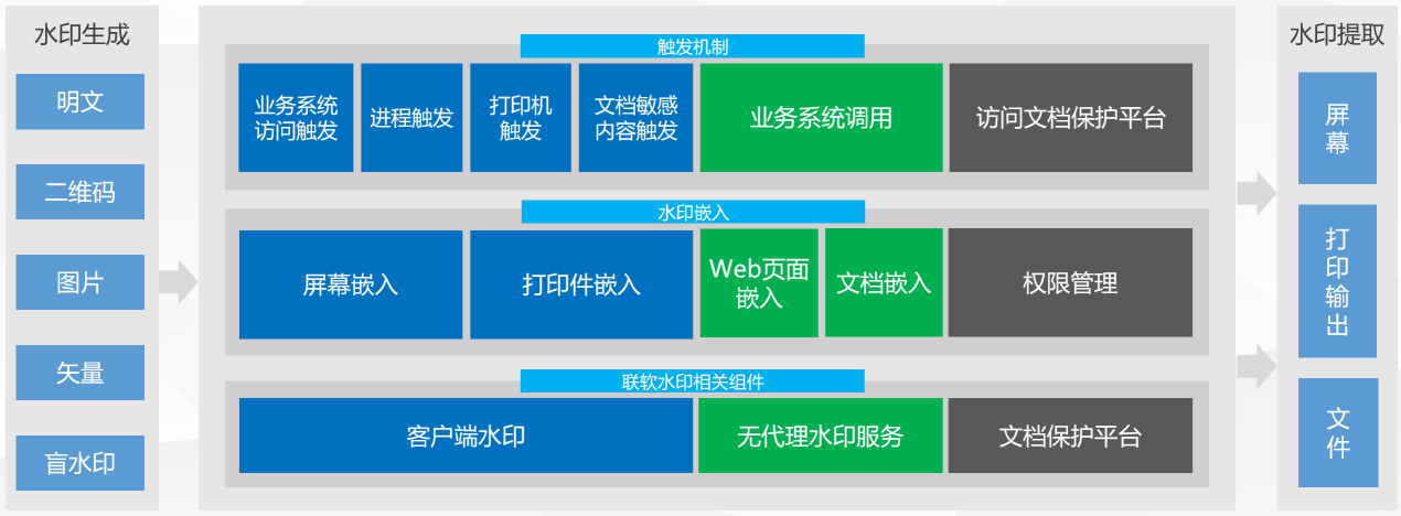 4、通過將企業(yè)業(yè)務(wù)系統(tǒng)與聯(lián)軟科技的水印服務(wù)器進行對接,將上述不同類型水印嵌入到業(yè)務(wù)系統(tǒng)頁面和從業(yè)務(wù)系統(tǒng)下載的文檔中;