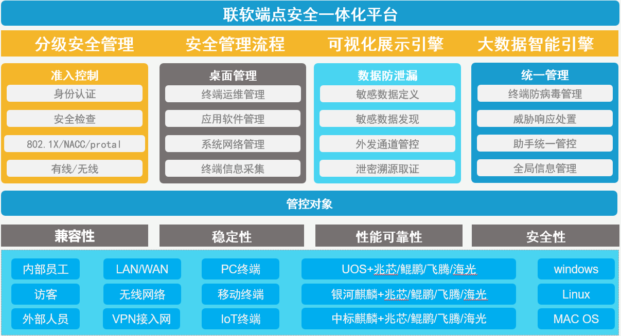 本方案以聯(lián)軟ESPP企業(yè)安全保護(hù)平臺(tái)為基礎(chǔ),幫助企業(yè)建立一個(gè)實(shí)現(xiàn)企業(yè)內(nèi)部終端安全保護(hù)、運(yùn)維管理及數(shù)據(jù)保護(hù)的一體化管控平臺(tái),解決企業(yè)計(jì)算機(jī)入網(wǎng)合規(guī)性和安全管理等問題,提供包含網(wǎng)絡(luò)準(zhǔn)入、桌面管理、數(shù)據(jù)防泄密、文檔安全、終端檢測(cè)與響應(yīng)、防病毒等功能。同時(shí)聯(lián)軟科技已經(jīng)完成與UOS、麒麟等信創(chuàng)操作系統(tǒng),龍芯、兆芯、飛騰、鯤鵬、X86等各類國(guó)產(chǎn)芯片,國(guó)產(chǎn)化數(shù)據(jù)庫(kù)與中間件進(jìn)行適配。方案可實(shí)現(xiàn):
