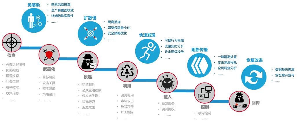 構(gòu)建免感染、防擴(kuò)散、快速發(fā)現(xiàn)、阻斷傳播、恢復(fù)改進(jìn)的立體式防勒索防御體系