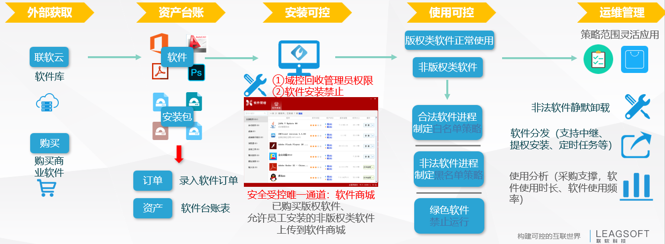 聯(lián)軟科技提供的央企能源行業(yè)軟件管理解決方案,不但滿足《正版軟件管理工作指南》中關(guān)于企業(yè)軟件正版化管理的要求,也能幫助企業(yè)規(guī)范軟件標(biāo)準(zhǔn)化管理。該方案包括以下內(nèi)容: