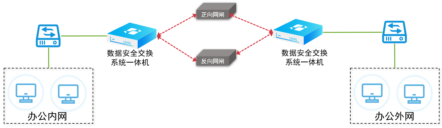 本方案以UniNXG數(shù)據(jù)安全擺渡系統(tǒng)為基礎(chǔ),針對(duì)電力行業(yè)安全Ⅲ區(qū)(辦公內(nèi)網(wǎng))與安全Ⅳ區(qū)(辦公外網(wǎng))數(shù)據(jù)交換與共享方式進(jìn)行創(chuàng)新與優(yōu)化,通過部署在網(wǎng)間的數(shù)據(jù)安全擺渡系統(tǒng),作為內(nèi)網(wǎng)終端與外部網(wǎng)絡(luò)終端的文件安全交換平臺(tái),同時(shí)配套電力級(jí)安全隔離裝置,在滿足辦公和業(yè)務(wù)對(duì)文件交換需求的同時(shí),實(shí)現(xiàn)物理與邏輯隔離場(chǎng)景下的文件流轉(zhuǎn)審批及殺毒管理,降低病毒感染和數(shù)據(jù)泄密的風(fēng)險(xiǎn)。具體如下: