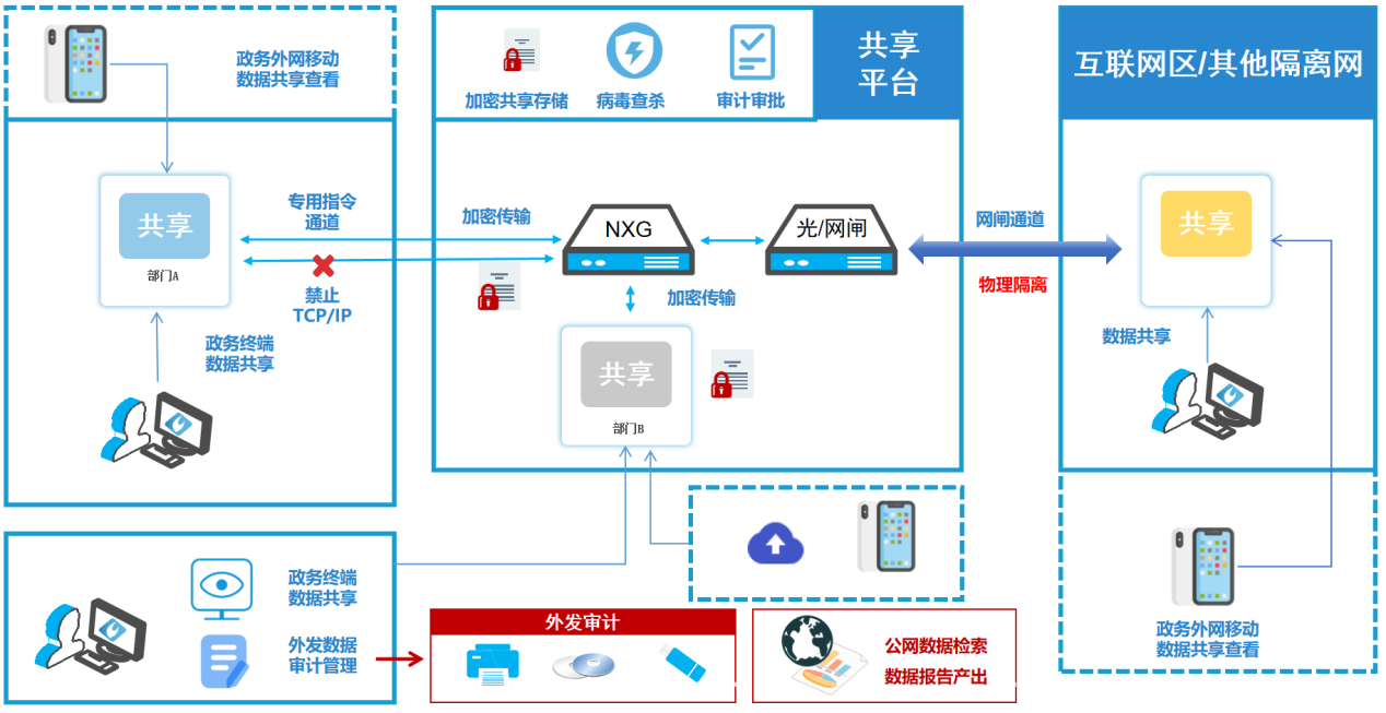 政策驅(qū)動:國家“十四五”規(guī)劃提出推進(jìn)政務(wù)信息化發(fā)展,同時針對網(wǎng)絡(luò)隔離提出技術(shù)要求,包含《信息安全等級保護(hù)管理辦法》以及《國家電子政務(wù)外網(wǎng)網(wǎng)絡(luò)與信息安全管理暫行辦法》,其明確提出不同網(wǎng)絡(luò)間的隔離要求,要安全隔離且高效的信息交換,需實現(xiàn)各區(qū)域之間邏輯隔離和安全有效控制。 業(yè)務(wù)驅(qū)動:由于政務(wù)場景下存在互聯(lián)網(wǎng)區(qū)、網(wǎng)關(guān)區(qū)、政務(wù)網(wǎng)區(qū)等其他分區(qū)分域情況,其產(chǎn)生大量政務(wù)敏感數(shù)據(jù)需要安全地進(jìn)行跨域傳輸,故需構(gòu)建一個安全的數(shù)據(jù)交換平臺,實現(xiàn)電子政務(wù)外網(wǎng)業(yè)務(wù)在本網(wǎng)絡(luò)及跨網(wǎng)絡(luò)間的數(shù)據(jù)安全傳輸效果。 場景驅(qū)動:在政務(wù)外網(wǎng)中,因一機兩用建設(shè)禁止政務(wù)數(shù)據(jù)外發(fā),但用戶依然存在內(nèi)部數(shù)據(jù)共享的場景,包括針對移動端建設(shè)也存在PC與移動數(shù)據(jù)共享查閱的場景。
